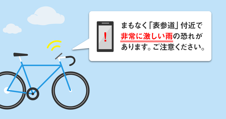 目的地の天候に変更が生じた場合や、ルート上に新たに気象警報/注意報が発令された場合、ゲリラ豪雨などの強い雨が発生する可能性がある場合に案内します。