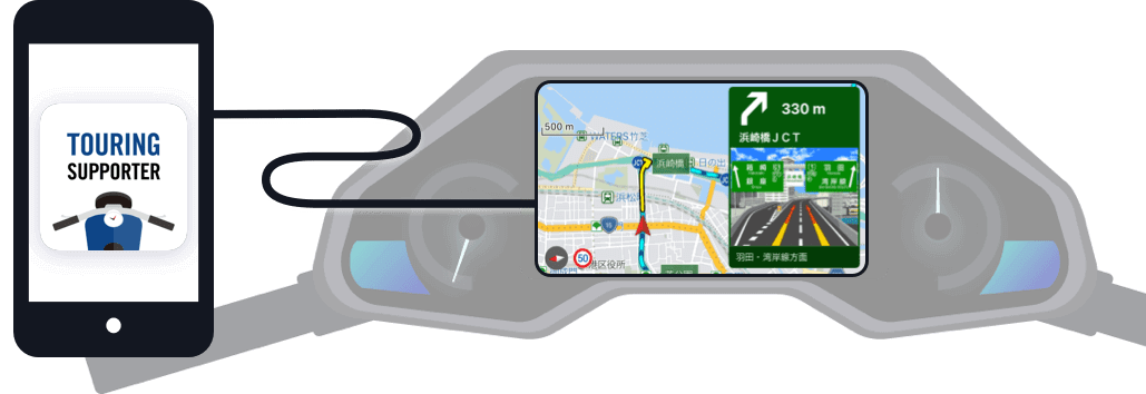 バイクの車載ディスプレイと接続し、ルート表示および案内をご利用いただけます。