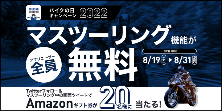 バイクの日(8月19日)にちなみ、対象期間中、マスツーリング機能が無料になります。また、マスツーリング機能の利用画面をTwitterへ投稿すると20名様に、Amazonギフト券¥819をプレゼント!マスツーリング機能をこの機会にぜひご利用ください。 参加条件、詳細は以下をご確認ください。