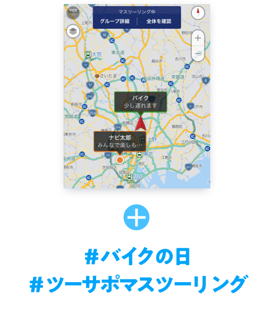 グループに参加している仲間に「位置」や「状態」を共有しながらツーリングができる機能です。